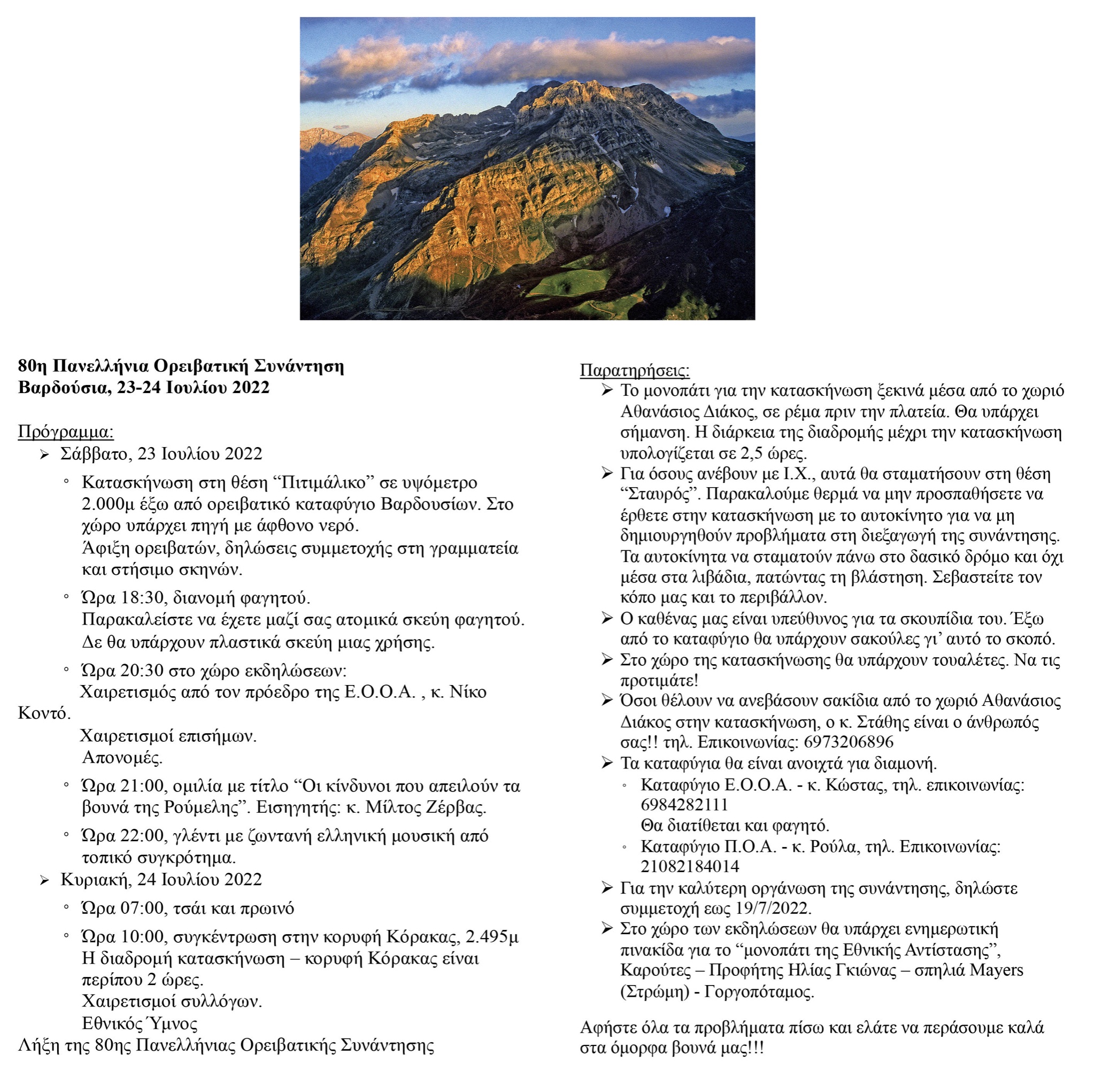 Αρχηγός : Λεωνίδας Ασλανίδης 6977822897. Διανυκτέρευση σε σκηνές. Το πρόγραμμα της εκδήλωσης :