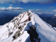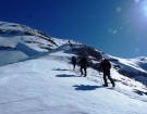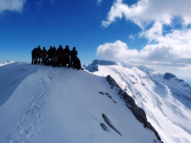 Η μέρα είναι πεντακάθαρη και καθώς ανεβαίνουμε στα δεξιά μας δεσπόζει η επιβλητική Ρόκα ενώ στα αριστερά η Στρογγούλα. Το χιόνι είναι πολύ καλό, παγωμένο όσο χρειάζεται για να μην βουλιάζουμε. Λίγο μετά τη στάνη σταματάμε για να φορέσουμε τις γκέτες και τα κραμπόν και να πιάσουμε το πιολέ στα χέρια μας. Μιας και για κάποιους ήταν η πρώτη φορά που τα χρησιμοποιούσαν οι πιο έμπειροι ανέλαβαν να δώσουν οδηγίες για τη σωστή τους χρήση.