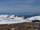 Η θέα των γύρω κορυφών είναι υπέροχη. Το χιόνι της εποχής αυτής δημιουργεί μοναδική ομορφιά στα βουνά. Το βλέμα μας φτάνει πολύ μακριά μέχρι τον χιονοσκέπαστο Όλυμπο και πιο κοντά μας βλέπουμε το Χατζή, τα Άγραφα, την Καλιακούδα, την Τύμφη, τον Σμόλικα, τη Νεμέρτσικα, τον Τόμαρο και τον Γκορίλα. Κινούμαστε προς το δυτικό άκρο του οροπεδίου από όπου έχουμε μια εντελώς διαφορετική οπτική γωνία της γνωστή κορυφής Καταφίδι, ενώ από κάτω μας φαίνεται η Ρόκα. Η μέρα είναι όμορφη και ζεστή και η κορυφή απαιτεί στάση για ξεκούραση, κολατσιό και προετοιμασία για κατάβαση.
