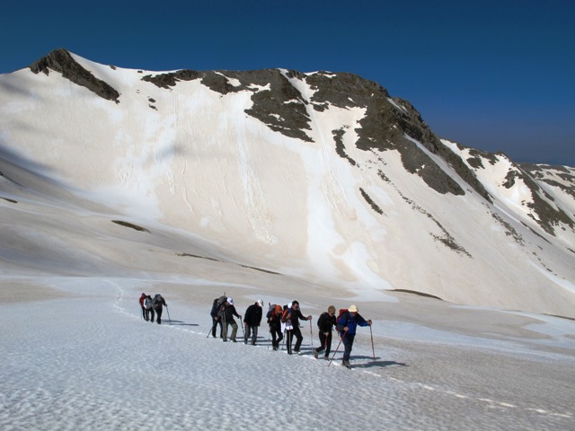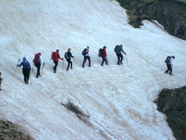 Το πρωί που ξυπνήσαμε ο καιρός είχε αλλάξει τελείως και η μέρα φαινόταν πως θα είναι ηλιόλουστη. Λίγο μετά το χωριό αφήνουμε τα αυτοκίνητα και παίρνουμε τον χωματόδρομο που οδηγεί στις στάνες. Περνάμε κάποια ρέματα με σχετική ευκολία και συνεχίζουμε στο δρόμο ενώ κάνουν την εμφάνισή τους και τα πρώτα χιόνια. Μετά από 2 περίπου ώρες χωριζόμαστε σε δύο ομάδες από τις οποίες η μια θα πάει στην Κακαρδίτσα και η άλλη στην κορυφή ''1060''. Η πρώτη ομάδα εγκαταλείπουμε το δρόμο και κινούμαστε προς την κορυφή. Το χιόνι είναι ακόμα σκληρό όποτε δεν χρειάζεται να βάλουμε γκέτες και έχοντας σαν στόχο την κορυφή την προσεγγίζουμε από τη δεξιά πλευρά. Η ανάβαση κοπιαστική μιας και η ανηφόρα είναι απότομη και φτάνοντας προς την κορυφή ο αέρας δυναμώνει. Ο αέρας στην κορυφή δυνατός και απαγορευτικός για στάση οπότε κατεβαίνουμε λίγα μέτρα πιο κάτω για να θαυμάσουμε τη θέα. Μπροστά μας βλέπουμε σε πρώτο πλάνο τα Γιάννενα με το Μιτσικέλι να δεσπόζει από πάνω, την Γκαμήλα, τον Σμόλικα, τον Τόμαρο και λίγο πιο πίσω η Νεμέρτσικα ενώ λίγο πιο αριστερά βρίσκονται τα δικά μας Τζουμέρκα. Αφού ξαποστάσαμε αποφασίσαμε να κάνουμε μια μικρή παραλλαγή και κατεβήκαμε από μια πιο απότομη πλευρά. Το χιόνι είχε μαλακώσει αρκετά οπότε φορέσαμε τις γκέτες μας και αρχίσαμε την κατάβαση. Γρήγορα ανακαλύψαμε πως πιο άνετα θα κατεβαίναμε τσουλώντας οπότε η πλαγιά του βουνού έγινε μια απέραντη τσουλήθρα.