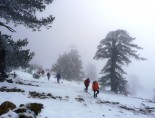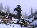 Έχουμε μπει για τα καλά μέσα στο δάσος και καθώς ανεβαίνουμε το ύψος του χιονιού αυξάνεται. Το δάσος είναι πυκνό και η ομίχλη αρχίζει να μας τυλίγει. Φτάνοντας στο δάσος η ομίχλη πλέον είναι αρκετά πυκνή και έχει μειώσει δυστυχώς την ορατότητά μας. Αποφασίζουμε να κατευθυνθούμε προς την κορυφογραμμή και ακολουθώντας τη να φτάσουμε στην κορυφή Φλέγκα (2.159μ). Καθώς περπατάμε μέσα στην ομίχλη και το χιόνι, δίπλα μας ξεπροβάλουν ρόμπολα με το χιόνι παγωμένο στις βελόνες τους να στέκουν σαν άγρυπνοι φρουροί της κορυφογραμμής. Μετά από 5:30 ώρες κοπιαστικής ανάβασης φτάνουμε στην κορυφή έχοντας δυστυχώς μηδενική ορατότητα. Για λίγες στιγμές μόνο ξεπροβάλει μέσα από τα σύννεφα το Περιστέρι με την λίμνη Αώου από κάτω, εικόνα μαγική.