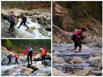 Φτάνουμε στο Αρκουδόρεμα και αφού κινηθούμε για λίγο παράλληλα με αυτό το διασχίζουμε πατώντας σε πέτρες. Μετά από λίγο καλούμαστε να το ξαναπεράσουμε βγάζοντας αυτή τη φορά τα παπούτσια μας. Είναι η πρώτη μας ψυχρολουσία αλλά μετά από αυτό τα πόδια μας έχουν αναζωογονηθεί. Κινούμαστε και πάλι δίπλα στο ρέμα θαυμάζοντας το δάσος αλλά και την άγρια ροή του ρέματος. Η διαδρομή είναι ομαλή χωρίς μεγάλες υψομετρικές διαφορές. Φτάνουμε στο ρέμα και το περνάμε βγάζοντας τα παπούτσια μας, συνολικά το περνάμε 5 φορές. Η ώρα περνάει και πλέον ήμαστε σίγουροι πως θα μας βρει η νύχτα μέσα στο ρέμα. Απολαμβάνουμε τη διαδρομή αποχαιρετώντας τις τελευταίες ακτίνες του ήλιου και μετά από λίγο βρισκόμαστε στη θέση Σμιξώματα όπου σμίγει το Αρκουδόρεμα με τον Αώο. Σε αυτό το σημείο το Αρκουδόρεμα είναι πολύ μεγαλύτερο από τον Αώο ο οποίος μοιάζει με ένα ρυάκι μπροστά του. Αποφασίζουμε να ακολουθήσουμε την πιο εύκολη και γρήγορη διαδρομή περπατώντας στο χωματόδρομο που οδηγεί στο καταφύγιο. Κατεβαίνουμε στο ρέμα, βγάζουμε τα παπούτσια μας και περνάμε και τα δύο ρέματα υπό το φως των φακών(που δεν πρέπει ποτέ να λείπουν από το σάκο μας).