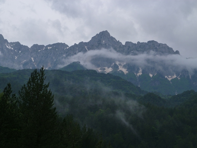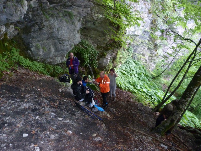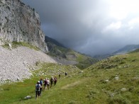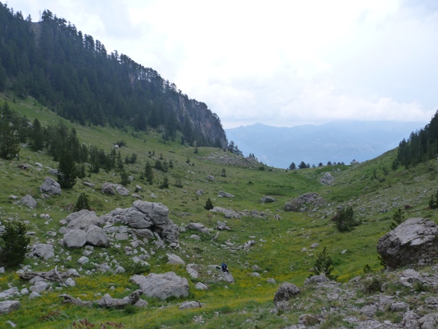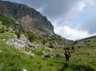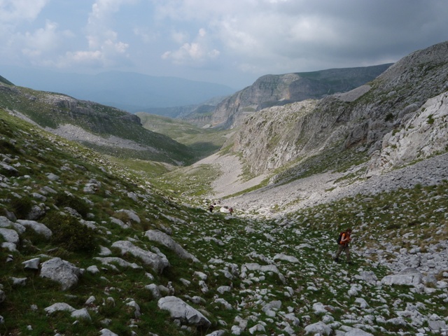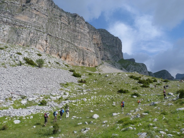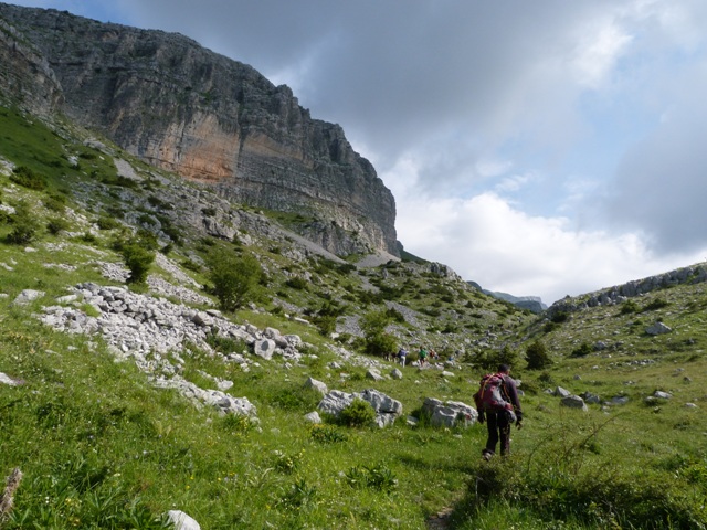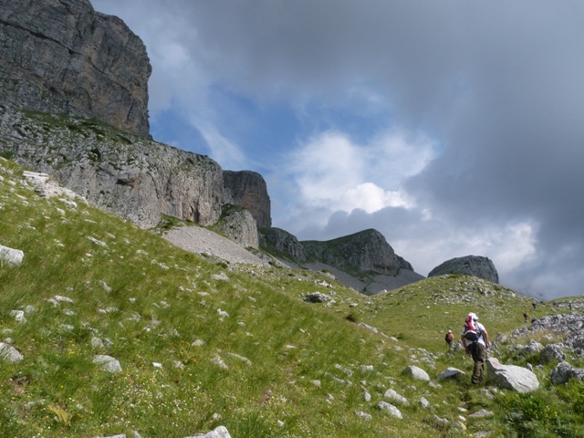 Λίγο το προχωρημένο της ώρας αναχώρησης, λίγο το ανιαρό περπάτημα στο χωματόδρομο κάνουν πιο έντονη τη δυσφορία από τη ζέστη αλλά μετά από μία 1 ώρα περίπου αφήνουμε το δρόμο και πιάνουμε μονοπάτι. Κινούμαστε πλέον μέσα σε κοιλάδα περιτριγυρισμένη από εντυπωσιακές απότομες ορθοπλαγιές ενώ περαστικά συννεφάκια μας χαρίζουν ανάσες δροσιάς. Συναντάμε στρογγυλή κτιστή στέρνα όπου και κάνουμε σύντομη στάση απολάμβάνοντας το αλπικό τοπίο. Τα σύννεφα αρχίζουν να πυκνώνουν και να χαμηλώνουν κρύβοντας τις ψηλότερες κορυφές.