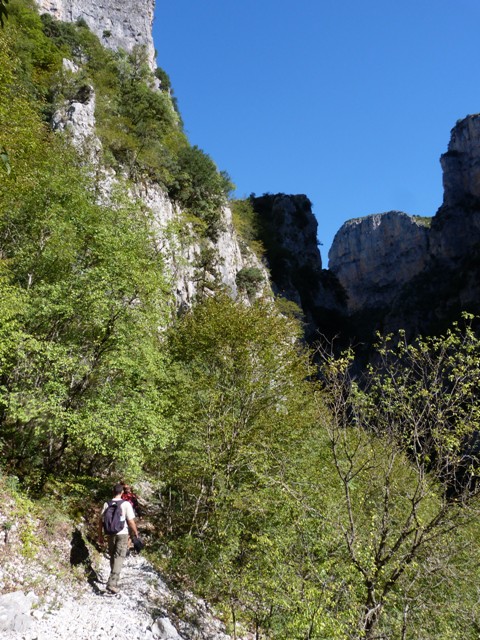 Η πορεία μας ξεκίνησε από το Μονοδέντρι από όπου πήραμε το κατηφορικό μονοπάτι που μας οδήγησε στον πάτο του φαραγγιού, δίπλα στην κοίτη του ξερού χειμάρρου. Στη συνέχεια περπατήσαμε για αρκετή ώρα στο μονοπάτι δίπλα στην κοίτη με το δάσος και τα βράχια να εναλλάσσονται. Θαυμάσαμε τις απότομες κοκκινωπές πλαγιές της χαράδρας και εντυπωσιαστήκαμε από το πυκνό παρθένο δάσος. Η διαδρομή ήταν εύκολη και γρήγορα φτάσαμε στις πανέμορφες πηγές του Βοϊδομάτη, του πιο καθαρού και κρύου ποταμού στην Ελλάδα. Κάναμε μια μεγάλη στάση και κάποιοι τολμηροί έκαναν μια βουτιά στα κρύα νερά του ποταμού ενώ άλλοι περιορίστηκαν να δροσίσουν τα πόδια τους μόνο. Μετά από τη στάση η ανηφόρα μέχρι το χωριό Βίκος μας φάνηκε πολύ εύκολη!!!!