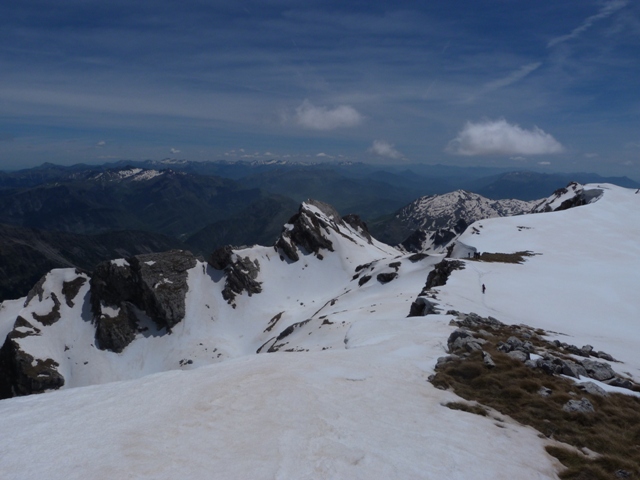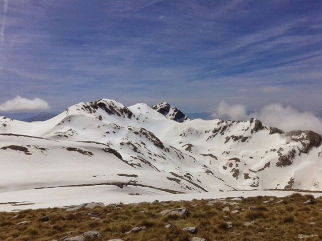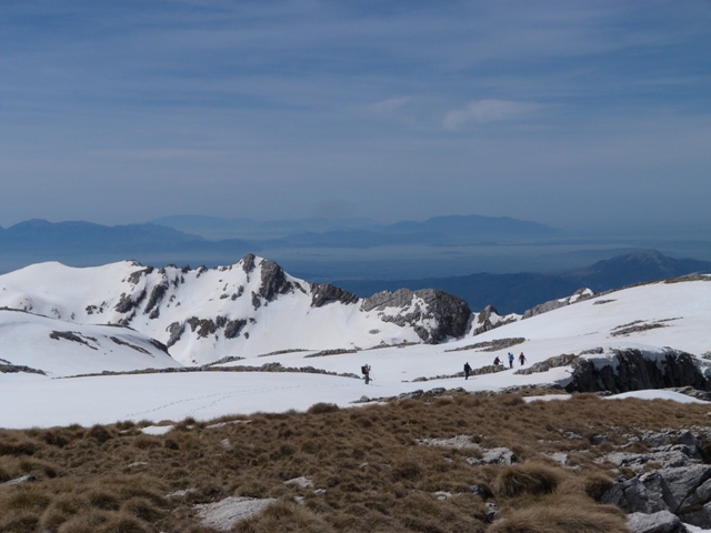 Η θέα των γύρω κορυφών είναι υπέροχη. Το χιόνι της εποχής αυτής δημιουργεί μοναδική ομορφιά στα βουνά. Το βλέμα μας φτάνει πολύ μακριά μέχρι τον χιονοσκέπαστο Όλυμπο και πιο κοντά μας βλέπουμε το Χατζή, τα Άγραφα, την Καλιακούδα, την Τύμφη, τον Σμόλικα, τη Νεμέρτσικα, τον Τόμαρο και τον Γκορίλα. Κινούμαστε προς το δυτικό άκρο του οροπεδίου από όπου έχουμε μια εντελώς διαφορετική οπτική γωνία της γνωστή κορυφής Καταφίδι, ενώ από κάτω μας φαίνεται η Ρόκα. Η μέρα είναι όμορφη και ζεστή και η κορυφή απαιτεί στάση για ξεκούραση, κολατσιό και προετοιμασία για κατάβαση.