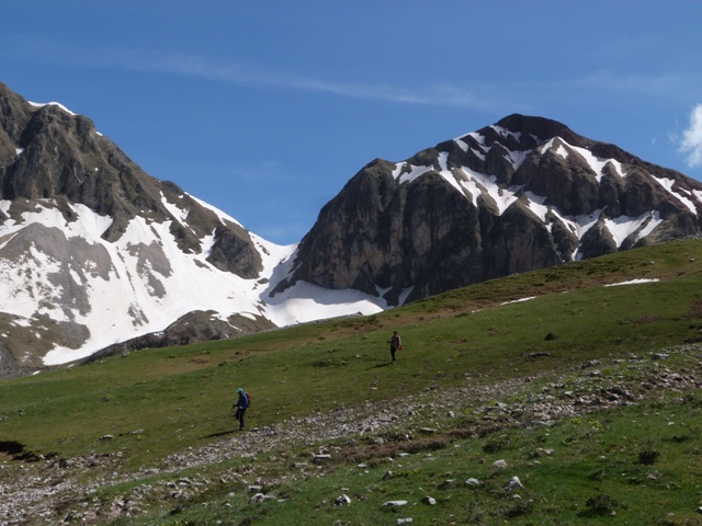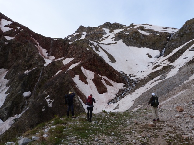 Ξεκινάμε, λοιπόν, από την πηγή Αγκάθι ανηφορίζουμε για το πρώτο διακριτό πέρασμα που είναι η στάνη Κολιοπάνου και έπειτα συνεχίζουμε από τη θέση Μπαλτενέσι. Μέχρι στιγμής δεν υπάρχει δυσκολία, παρά μια αίσθηση περιπάτου αφού συνοδευόμαστε από τον ήχο του νερού που κατεβαίνει τις πλαγιές και στη θέα μας βλέπουμε πολλούς μικρούς καταρράκτες, κάποιοι από τους οποίους είναι κρεμαστοί, σε ψηλότερα σημεία του βουνού. Ο δρόμος προς την κορυφή γίνεται πιο απαιτητικός αφού η κλίση της πλαγιάς αυξάνει και τα βήματά μας εναλλάσσονται μεταξύ χιονιού και του δύσβατου εδάφους του βουνού. Πίσω μας υψώνονται ο Σταυρός και το βουνό 1060 ενώ πιο πίσω ξεπροβάλει η Κακαρδίτσα, στα αριστερά μας φαίνεται καθαρά ο Κρυάκουρας. Η μέρα είναι ηλιόλουστη, ο ουρανός καθαρός και ελπίζουμε ότι στην κορυφή η διαύγεια θα μας επιτρέψει τη θέα του Ολύμπου.