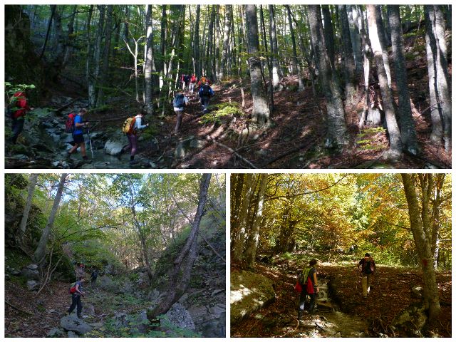 Στο φαράγγι της Μικρής ΤζέναςΜετά από έναν καλό ύπνο στο σχολείο της Νότιας μπαίνουμε στα αυτοκίνητα και φτάνουμε κάτω από το φαράγγι της Μικρής Τζένας. Αν και η ώρα είναι 7 το πρωί ο ήλιος δεν έχει κάνει την εμφάνισή του. Περιμένουμε να ξημερώσει και έπειτα αρχίζουμε να περπατάμε με σκοπό να θαυμάσουμε το υπέροχο φαράγγι. Τα λόγια είναι πολύ φτωχά για να μπορέσω να περιγράψω το φαράγγι. Περπατάμε μέσα σ' ένα φαράγγι κατάφυτο με οξιές ενώ δίπλα μας κυλάει το ρυάκι. Οι οξιές είναι αρχικά πράσινες αλλά όσο ανεβαίνουμε παίρνουν το χαρακτηριστικό κιτρινοκόκκινο χρώμα. Παρατηρήσαμε επίσης κάποιες σημύδες , γεγονός που καθιστά τη Τζένα ένα από τα νοτιότερα σημεία εξάπλωσής τους στην Ευρώπη. Το φαράγγι είναι στενό και σε κάποια σημεία βλέπουμε τα απότομα τοιχώματά του να ορθώνονται από πάνω μας. Το μονοπάτι καλογραμμένο και καλοσημαδεμένο, σε μερικά σημεία είναι χτιστό που σημαίνει ότι χρησιμοποιούνταν από πολύ παλιά. Λίγη ώρα μετά την είσοδο βρίσκουμε χτίσματα μισογκρεμισμένα, ίσως κάποιο παλιό εγκαταλειμμένο χωριό, ίσως κτίσματα που να έχουν μείνει από τους Βαλκανικούς πολέμους. Προχωράμε θαυμάζοντας τους καταρράκτες που σχηματίζονται συνέχεια κατά τη διάρκεια της διαδρομής ενώ συνέχεια διασχίζουμε το ποταμάκι (συνολικά 25 φορές).
