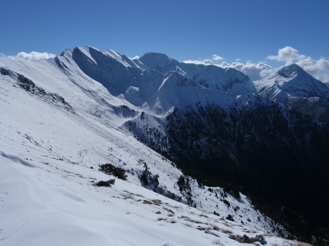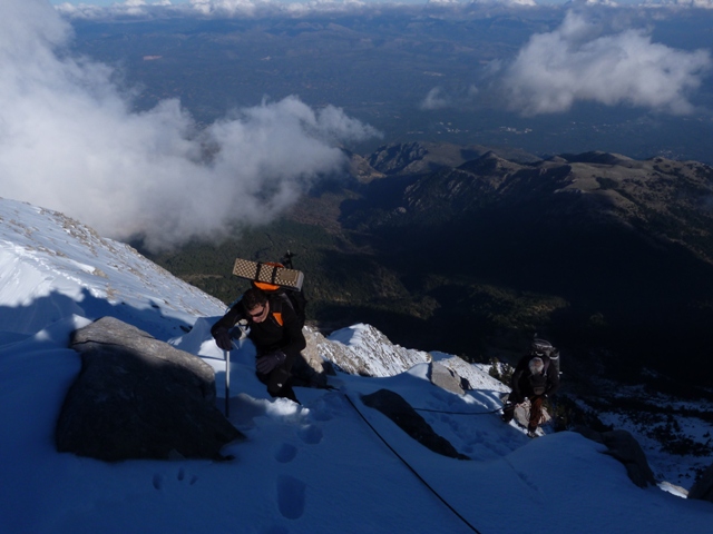 Καθώς περνάει η ώρα και ανεβαίνουμε κάθε κορυφούλα και ραχούλα του Πενταδάκτυλου ανακαλύπτουμε πως το ανάγλυφο έχει πιο πολλά ανεβοκατεβάσματα από ότι περιμέναμε ενώ η ποιότητα του χιονιού δεν είναι καλή. Τα χρήματα που επενδύσαμε σε εξοπλισμό φαίνεται να απέδωσαν μιας και τα πόδια των περισσοτέρων είναι στεγνά. Δυστυχώς ο φίλος μας ο Ηλίας υπερεκτίμησε τις δυνατότητες των παπουτσιών τα οποία έγιναν μούσκεμα και άρχισαν να τον ταλαιπωρούν. Φτάνοντας στο Σιδηρόκαστρο τα πράγματα δυσκολεύουν. Το πέρασμα σχετικά δύσκολο αλλά το ψυχολογικό κομμάτι ανεβάζει αρκετά τη δυσκολία μιας και οι λάθος κινήσεις δεν συγχωρούνται. Έτσι αποφασίζουμε να βάλουμε το σκοινί και να δεθούμε (κυρίως για ψυχολογικούς λόγους) για να σκαρφαλώσουμε.