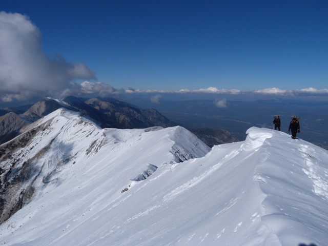 Το πρωί 7 άτομα ξεκινάμε την πορεία μας προς τον Πενταδάκτυλο, άλλα δυο άτομα θα πάνε στο καταφύγιο της Σπάρτης και από εκεί θα ανέβουν στον Προφήτη Ηλία και θα είναι η ομάδα υποστήριξης που θα μας παραλάβει την Κυριακή. Φορτωνόμαστε τα σακίδιά μας και αρχίζουμε την ανοδική πορεία. Αποφασίζουμε να περάσουμε από τη θέση Τσάρκος και την κορυφή Σπανακάκι. Βρίσκουμε το καταφύγιο ανάγκης στον Τσάρκο με την σκεπή πεσμένη σε ένα τμήμα της και τα χιόνια να μπαίνουν μέσα. Παίρνουμε και πάλι την ανηφόρα για την κορυφή Σπανακάκι και από εκεί βλέπουμε σχεδόν όλο τον Πενταδάχτυλο να απλώνεται μπροστά μας. Ο καιρός είναι καλός με αποτέλεσμα το χιόνι να έχει «σουπιάσει», τα βήματα να ανοίγονται με κόπο και η πορεία να είναι αργή.