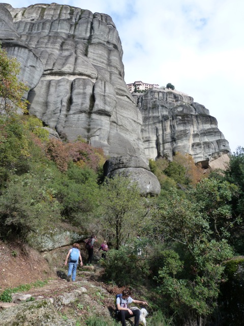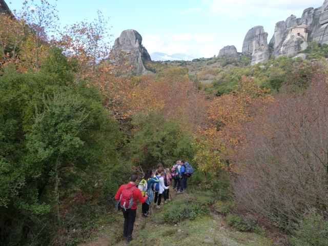 Στην απέναντι μεριά της κοιλάδας βλέπουμε τις μονές Αγ. Νικολάου του Αναπαυσά, Μεταμόρφωσης του Σωτήρος, Βαρλαάμ και Ρουσάνου κι αριστερά μας βρίσκονται οι Φυλακές των Μοναχών (εδώ απομονώνονταν όσοι μοναχοί θεωρούσαν πως είχαν υποπέσει σε κάποια αμαρτία). Διασχίζουμε το ρέμα της Παλιοκρανιάς και κατευθυνόμαστε προς τη μονή Βαρλαάμ πάνω σε όμορφο λιθόστρωτο μονοπάτι. Μετά από σύντομη επίσκεψη στη μονή πηγαίνουμε προς το Μεγάλο Μετέωρο από όπου μια ομάδα θα συνεχίσει την πορεία και μια άλλη θα παραμείνει για επίσκεψη στο μοναστήρι κι επιστροφή με το λεωφορείο στο χωριό.