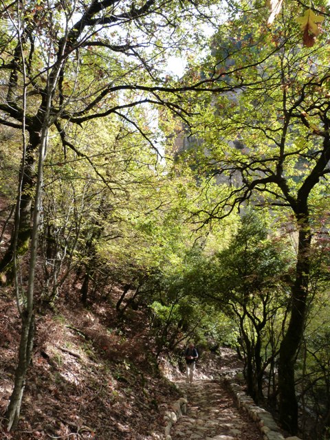 Η πρώτη ομάδα που συνεχίζουμε τη διαδρομή βρισκόμαστε πλέον στο πίσω μέρος των Μετεώρων (Hinterer Meteoratum όπως αναφέρεται στους αναρριχητικούς οδηγούς). Εδώ δεν υπάρχουν πολλοί επισκέπτες καθώς δεν υπάρχουν και μοναστήρια και μόνο κάποιοι αναρριχητές που και που δοκιμάζουν τις δυνάμεις τους στα βράχια. Το τοπίο έχει αλλάξει εντελώς κι ενώ πριν κινούμασταν χαμηλά μέσα σε ένα δάσος από βράχια τώρα κινούμαστε πάνω στις κορυφές τους που είναι σκεπασμένες με αρκετή χαμηλή βλάστηση. Μπροστά μας απλώνεται ένα δάσος στα χρώματα του φθινοπώρου ενώ στο αριστερό μας χέρι βρίσκονται διάσπαρτοι διάφοροι βράχοι. Περπατάμε πάνω σε έναν από αυτούς και κοιτάζοντας προς τα κάτω αντικρίζουμε το χάος. Συνεχίζουμε μέχρι το μνημείο Βλαχάβα και μετά περνώντας κάτω από τη Μονή της Υπαπαντής μπαίνουμε σε υπέροχο δρυόδασος με μαγευτικά χρώματα. Περνάμε από την περιοχή που σύμφωνα με μαρτυρίες βρισκόταν το Παλιό Καστράκι και φτάνουμε στον βράχο της Δούπιανης όπου θαυμάζουμε την εγκαταλελειμένη Μονή Παντοκράτορος. Κοντά στα όρια του χωριού ξανά, διασχίζουμε τον ασφάλτινο δρόμο και το ρέμα της Παλιοκρανιάς και περπατώντας στα όμορφα λιβάδια κάτω από τον βράχο του Αγίου Πνεύματος φτάνουμε στον Αγ. Γεώργιο τον Μαντηλά κι από εκεί στην πλατεία του χωριού τελειώνοντας μια πολύ ωραία πορεία ανάμεσα στα βράχια των Μετεώρων.