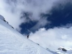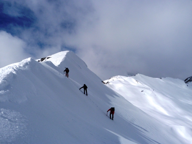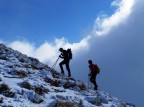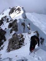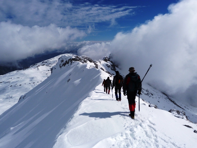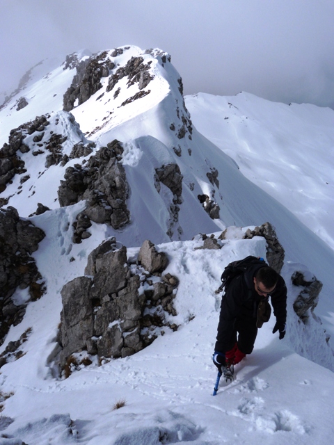 Αρχίζουμε την απότομη ανάβαση περπατώντας κυρίως σε γιδόστρατα μέχρι που βρίσκουμε ένα καλύτερο μονοπάτι το οποίο και ακολουθούμε. Το έδαφος πετρώδες και μόνο λίγο χιόνι φαίνονταν κάτω από την κορυφή. Βρισκόμαστε πάνω από τα σύννεφα και ο ήλιος λάμπει ανεβάζοντας τη θερμοκρασία. Λίγο πριν την κουρυφή φοράμε τις γκέτες μας και τα κραμπόν. Ύστερα από 2:30 ώρες πορείας φτάνουμε στην κορυφή Σκοπός (2.058μ). Η θέα εντυπωσιακή, μιας και η βορινή πλευρά του βουνού έχει κρατήσει πολύ περισσότερο χιόνι σε σχέση τη νότια. Τα σύννεφα έχουν κάτσει σαν σκουφάκια στις ψηλότερες κορυφές των Τζουμέρκων.