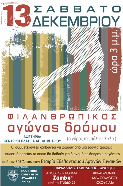 Το Σάββατο στις 13 Δεκεμβρίου ο ΕΟΣ Άρτας διοργάνωσε για τρίτη συνεχόμενη χρονιά φιλανθρωπικό αγώνα δρόμου με σκοπό να συγκεντρωθούν τρόφιμα που θα δοθούν σε άπορες οικογένειες της περιοχής. Η διανομή θα γίνει από την Εταιρεία Εθελοντισμόυ Αρτινών Γυναικών.
