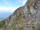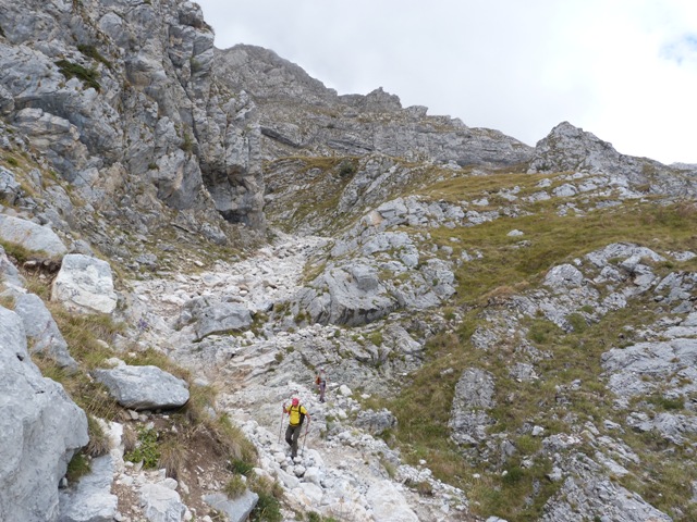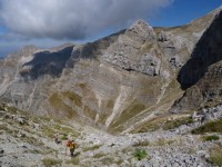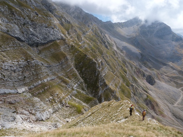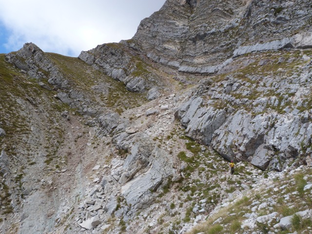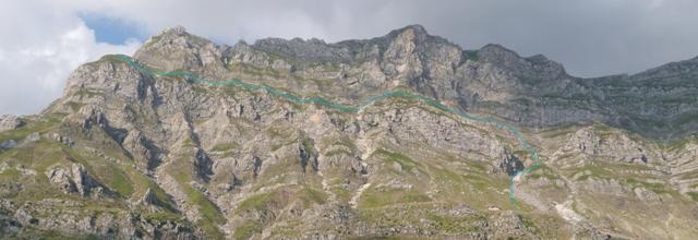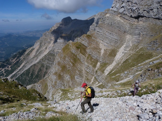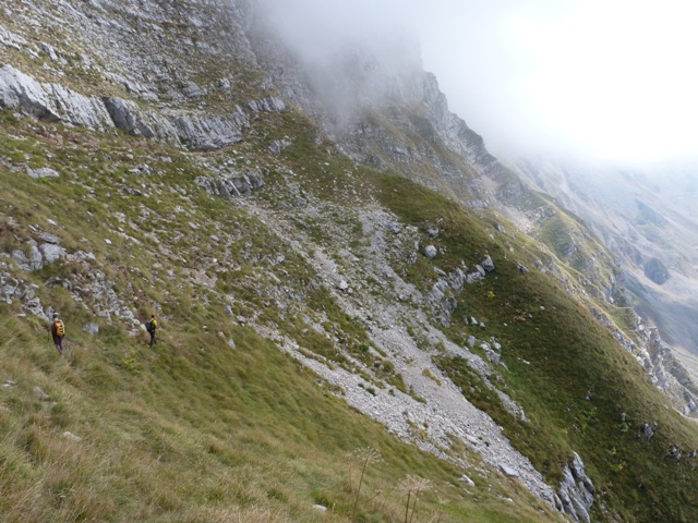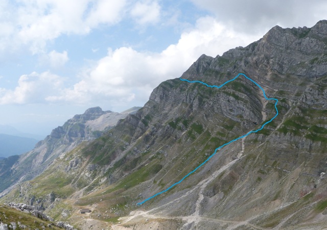 Για να βρούμε το μονοπάτι πήραμε τη Σκάλα Σταμάτη μέχρι το σημείο που ενώνεται με το Σύρμα και από εκεί συνεχίσαμε ανεβαίνοντας αρκετά πιο ψηλά από τη Σκάλα και μετά από περίπου 30 λεπτά αρχίσαμε να κινούμαστε στο φυσικό ζωνάρι που σχηματίζει το βουνό. Για καλή μας τύχη οι βοσκοί είχαν γυρίσει κάτω την προηγούμενη βδομάδα οπότε τα χόρτα ήταν πατημένα και αυτό μας διευκόλυνε αρκετά στην εύρεση του μονοπατιού. Φτάνοντας στο σημείο όπου είχαμε ολοκληρώσει την προσπάθεια μας την προηγούμενη φορά πλησιάζοντας κοντά είδαμε το μονοπάτι να συνεχίζει απέναντι και ένα σχετικά φρέσκο πέρασμα να κόβει τη ρεματιά. Την περάσαμε άλλοι πιο εύκολα άλλοι πιο δύσκολα μιας και τα πατήματα ήταν λίγα και κάποιες πέτρες έφευγαν ενώ ήταν ίσως το μοναδικό σημείο σε όλη τη διαδρομή που δεν συγχωρούσε λάθος. Το μονοπάτι συνέχιζε με μια ελαφριά κλίση προς τα κάτω αλλά γενικά δεν έχανε ύψος μέχρι που φτάσαμε σχεδόν στο ύψος του καταφυγίου. Στο σημείο αυτό άρχιζε να κατηφορίζει απότομα χάνοντας αρκετά ύψος και κινούμενο σε μια ράχη, στη συνέχεια χρειάστηκε να περάσουμε άλλη μια ρεματιά αρκετά εύκολη και κατεβήκαμε στο καταφύγιο που ήταν πλέον πολυ κοντά.